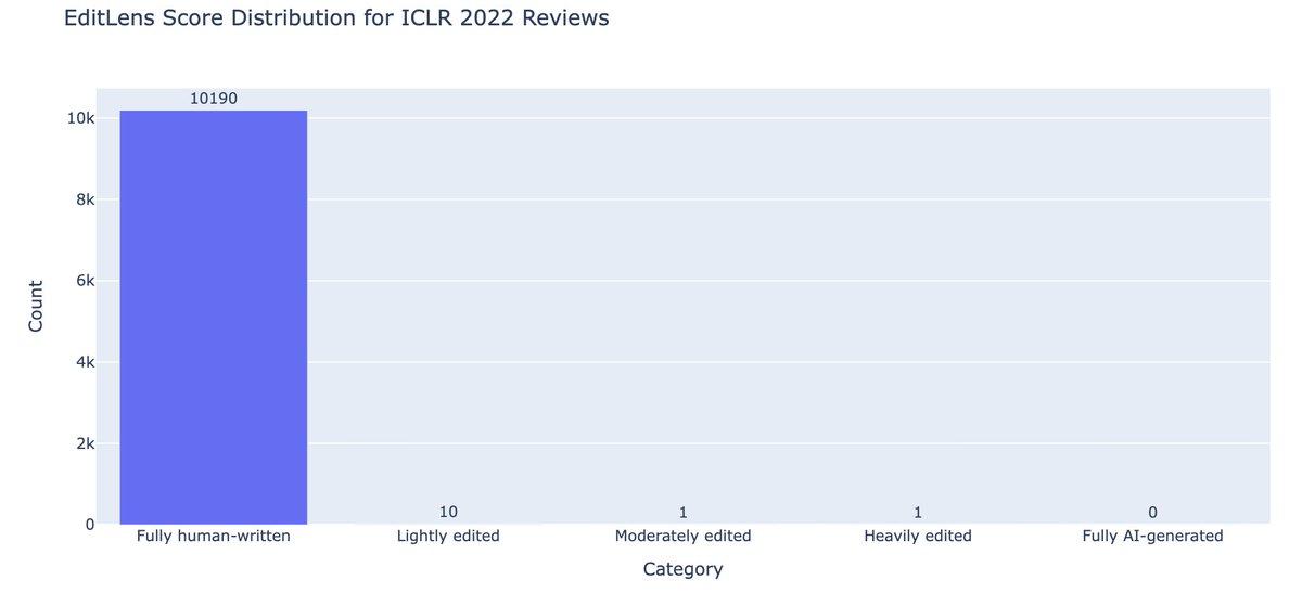 We also checked the peer reviews for AI using our new EditLens model. EditLens is able to not only detect the presence of AI, but can also describe the degree to which AI was involved in the editing process. EditLens can predict that a text falls within one of five categories: