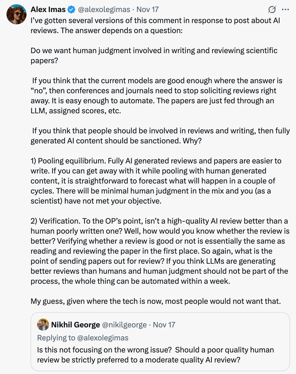 However, the question remains: if AI can generate helpful feedback, why should we prohibit fully AI-generated reviews? University of Chicago economist Alex Imas articulates the core issue in a recent tweet: the answer depends on whether we want human judgment involved in scientific peer review.