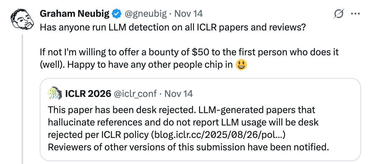 In all seriousness, many ICLR authors and reviewers have been noticing some cases of blantant AI-related scientific misconduct, such as an LLM-generated paper with completely hallucinated references, and many authors claiming to receive completely AI-generated reviews.
