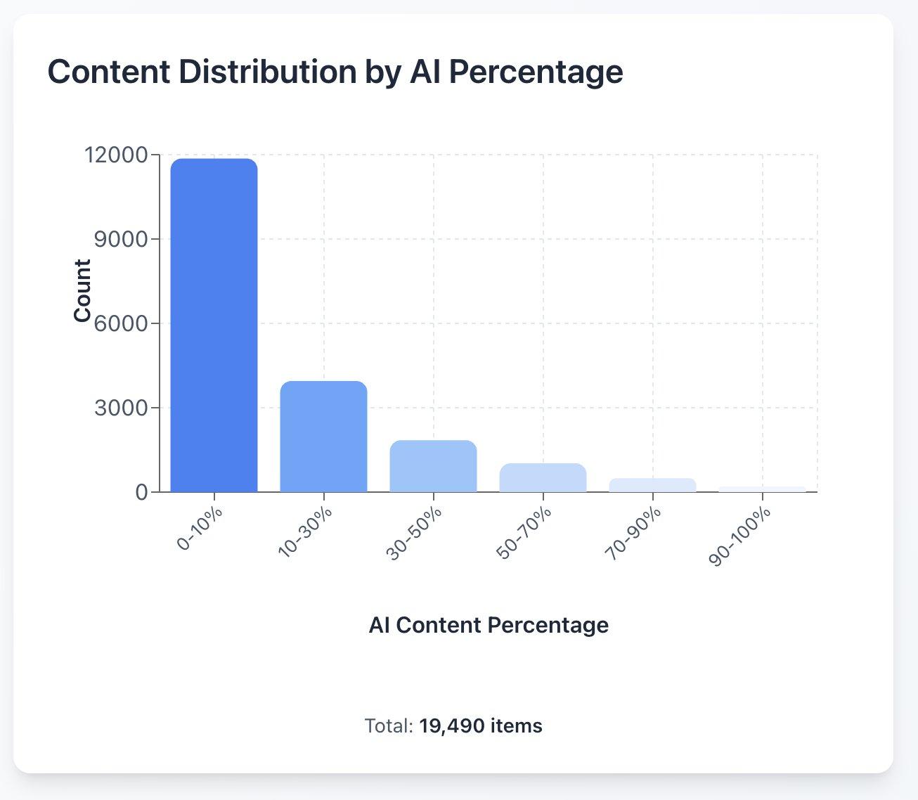 We found 21%, or 15,899 reviews, were fully AI-generated. We found over half of the reviews had some form of AI involvement, either AI editing, assistance, or full AI-generation.