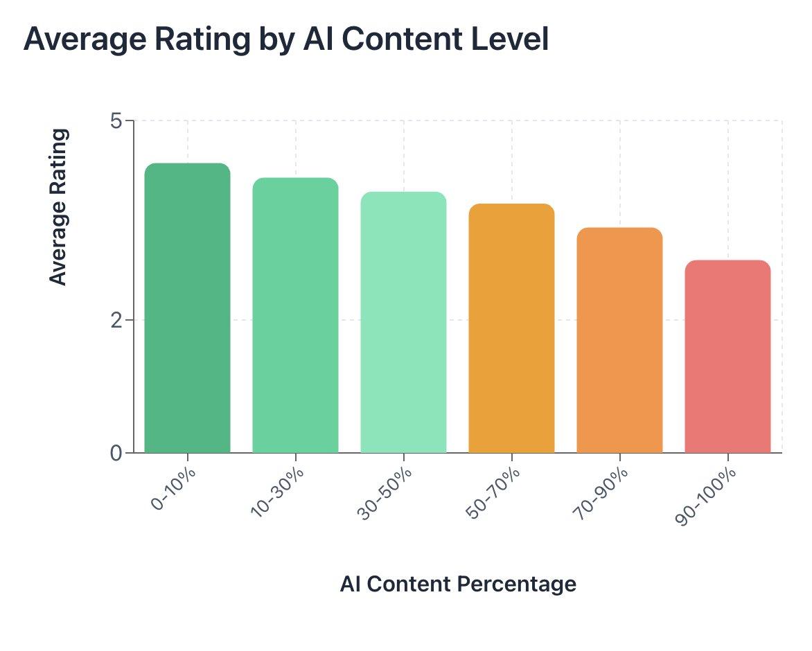 This could be for multiple reasons. One is that the more AI is used in a paper, the less well-thought out and executed the paper is overall. It is possible that when AI is used in scientific writing, it is more often used for offloading and shortcutting rather than used as an additive assistant. Additionally, fully AI-generated papers receiving lower scores potentially indicates that AI-generated research is still low quality slop, and not a real contribution to science (yet).